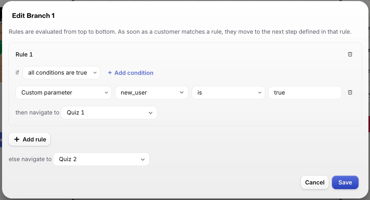When redirecting users back to the funnel, I could include a query parameter like ?new_user={true|false}, along with state and app_user_id. However, I don’t see any option in the funnel settings that allows branching based on these parameters.