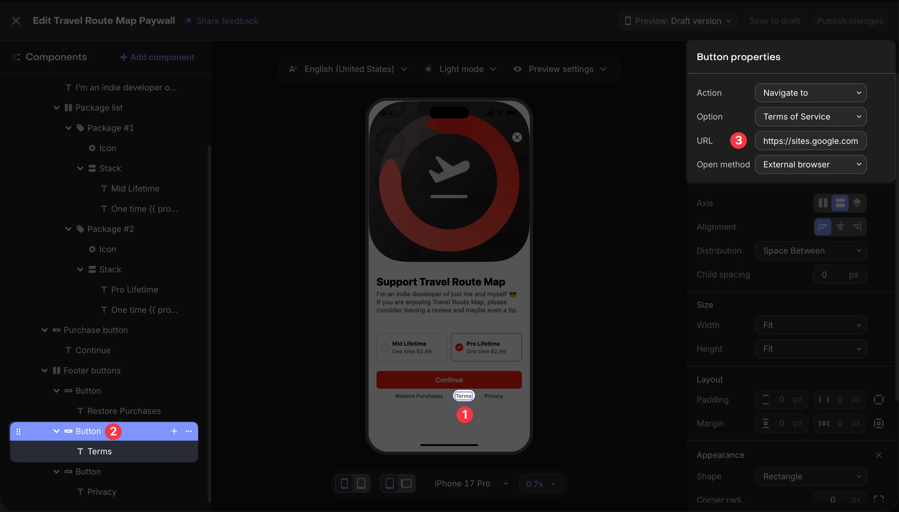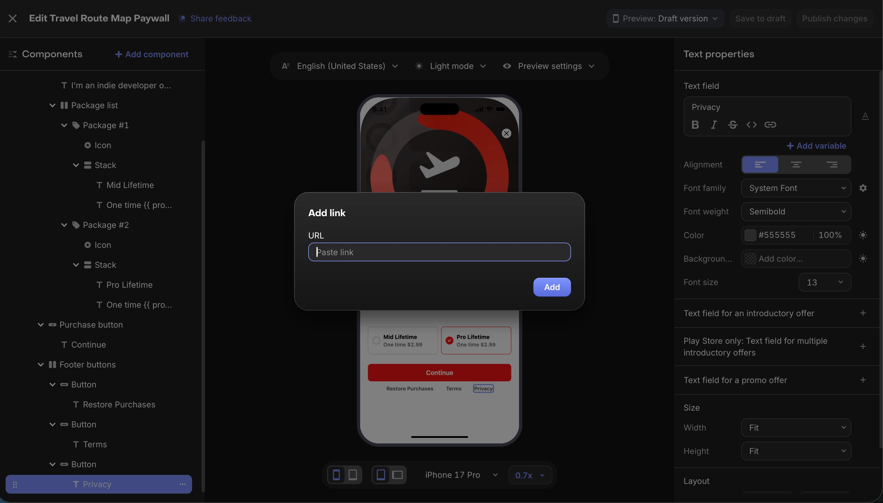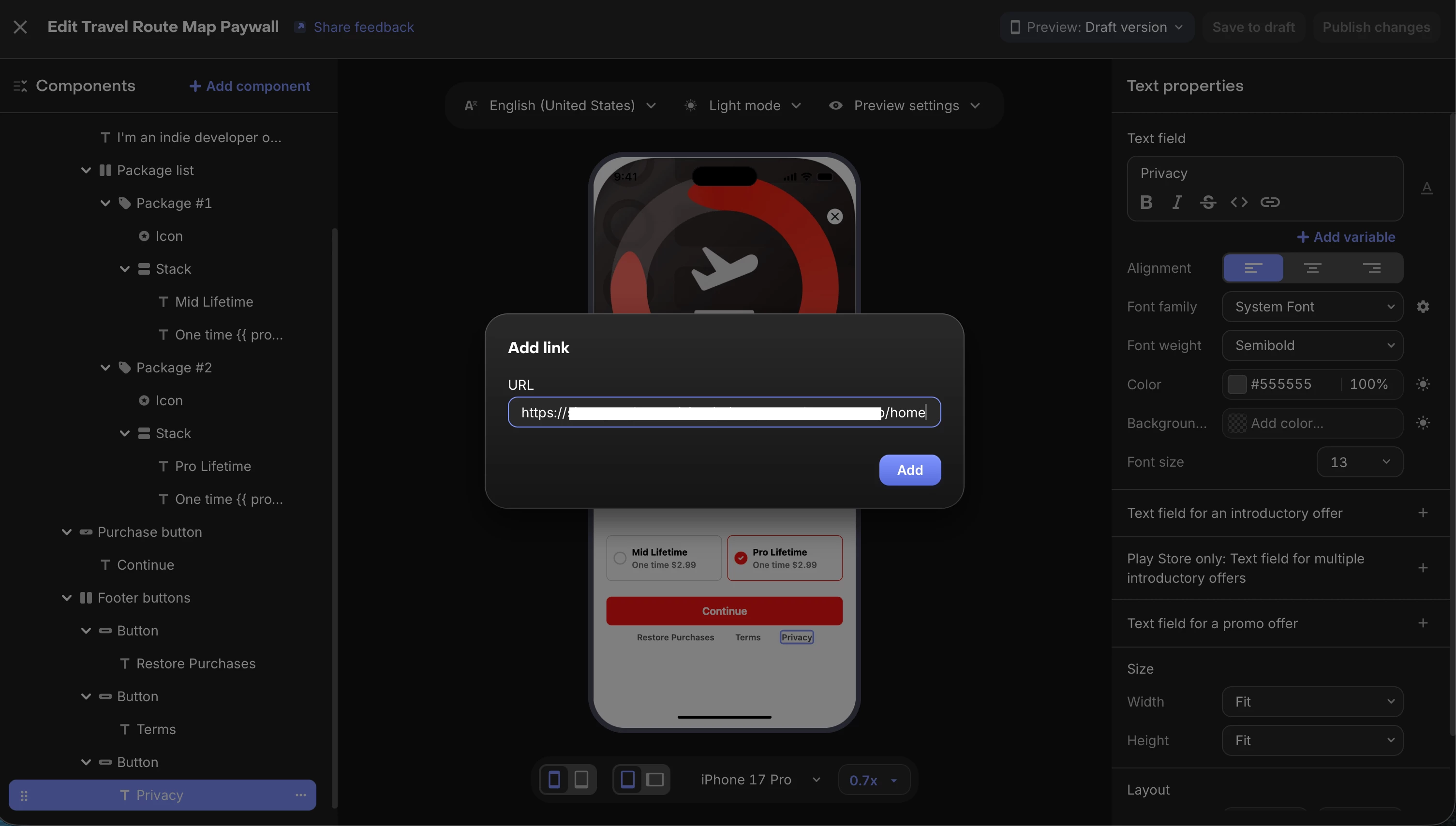 I try add links to “Terms” and “Privacy” Footer buttons on the paywall builder but they disappear immediately when I click on a different element and not being saved. The following screenshots are sequential in that actions that I take. Hence, Apple is rejecting builds since there are no original Terms and Privacy links but just default RevenueCat url “https://example.com”.