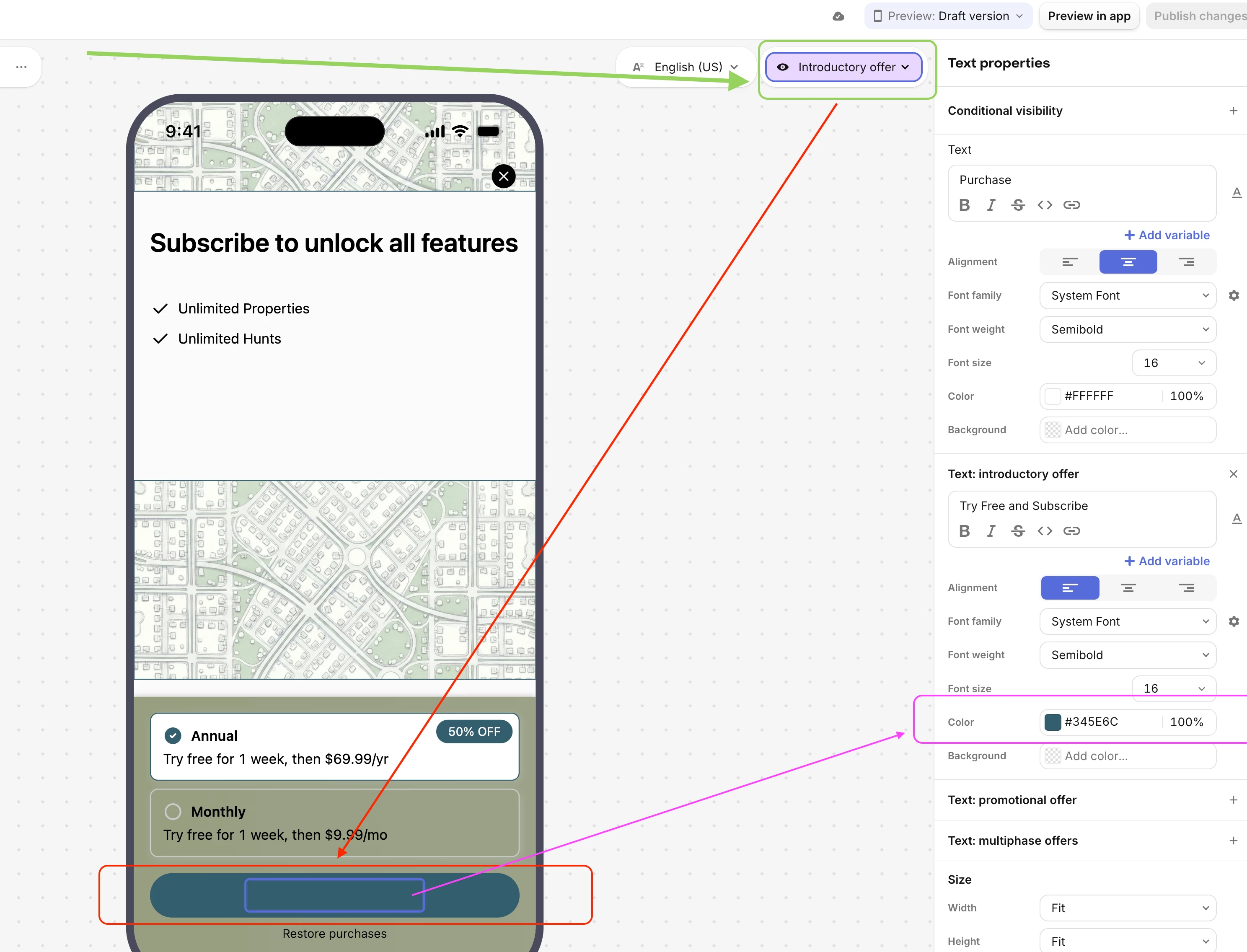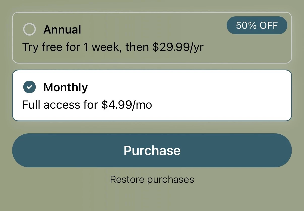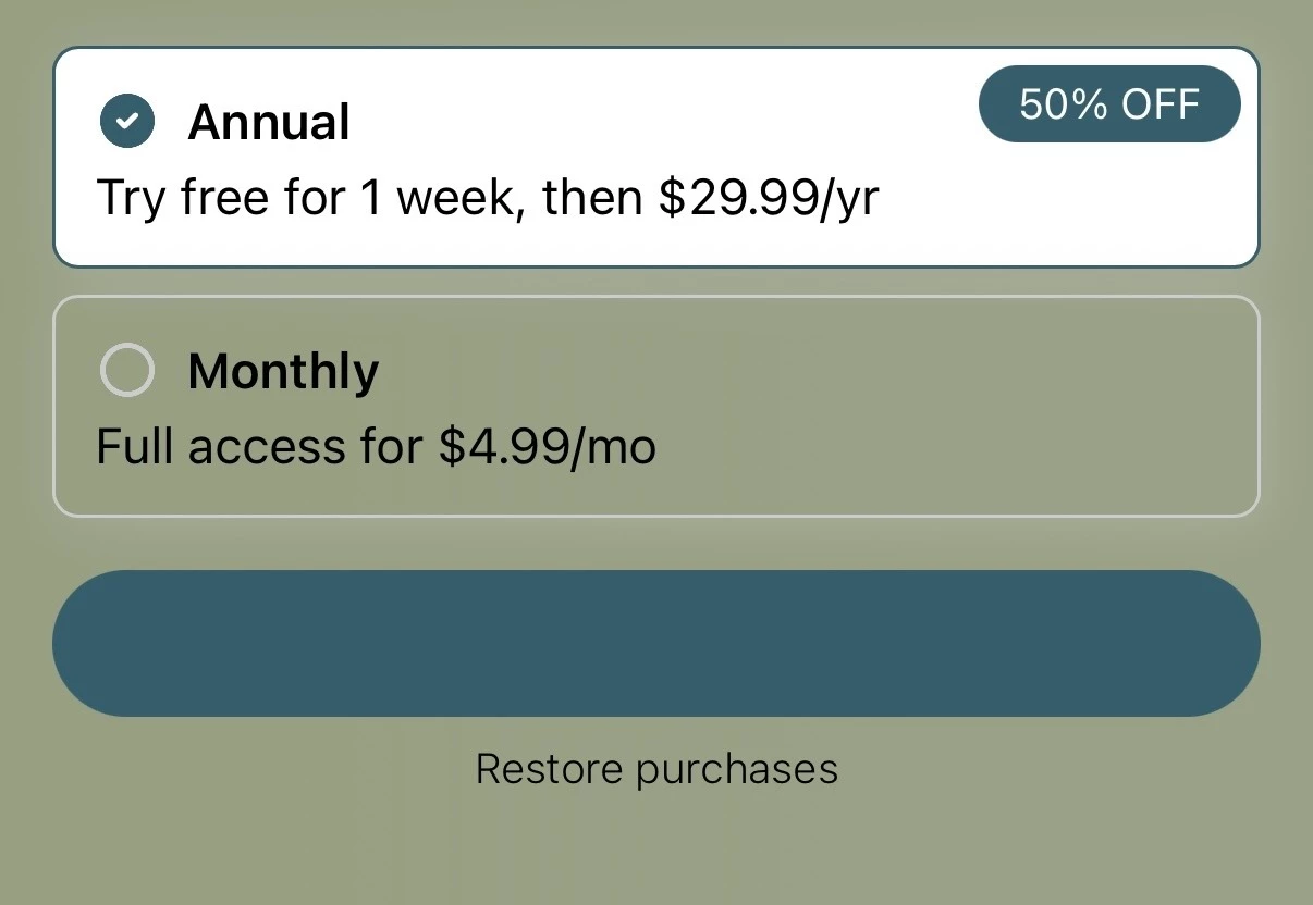 Hi, having trouble with the Purchase Button Text. In the paywall creator, all is fine. When I build my app though (iOS), the Purchase Button Text does not show when the annual plan is selected, but if I select the monthly plan then the text does appear. Tap annual again, and it disappears. See screenshots below. Any advice on how to fix this? Thanks so much!