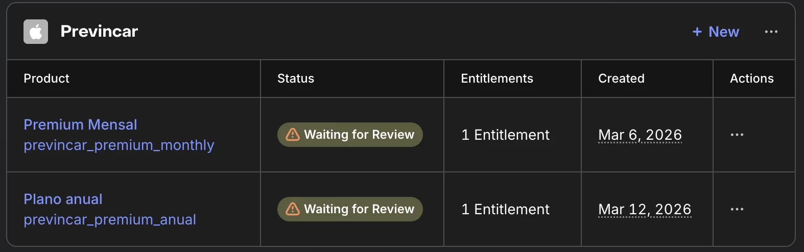 The only potential issue I can identify is the subscription status. The products are currently listed as “Waiting for Review” in App Store Connect and also appear with the same status in the RevenueCat dashboard.