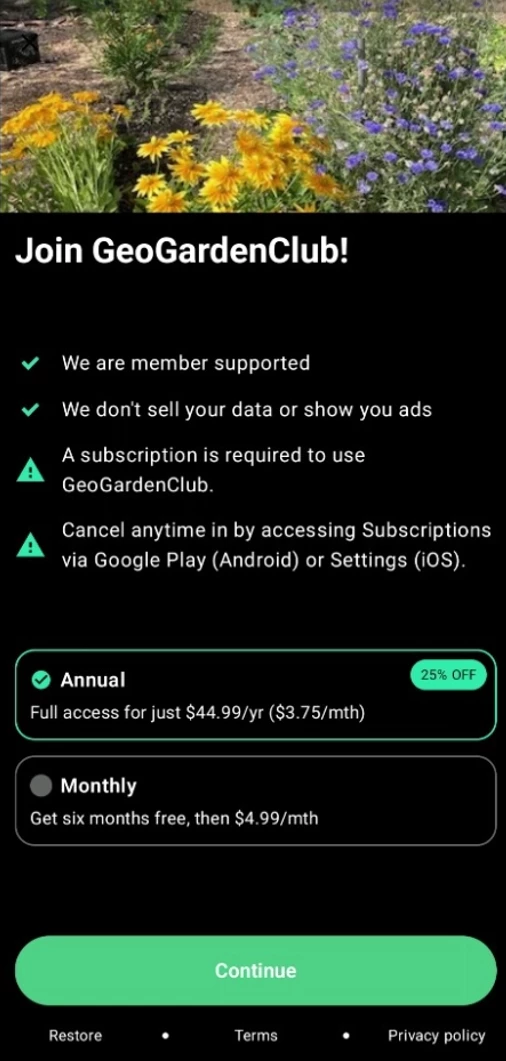 'Note: you must subscribe to access any features of GeoGardenClub.');
