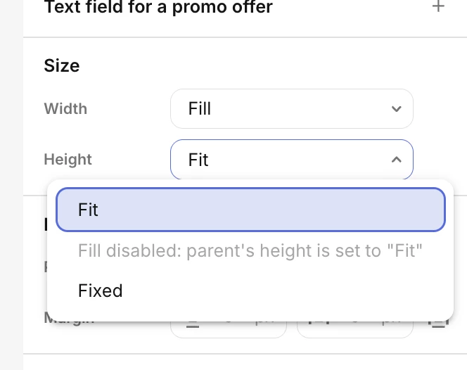 Another issue that I see is this message: fill disabled: parent's height is set to "fit" .  But there’s no parent, and this is done with the propertie fill selected on figma, so should be fill selected on RevenueCat also.