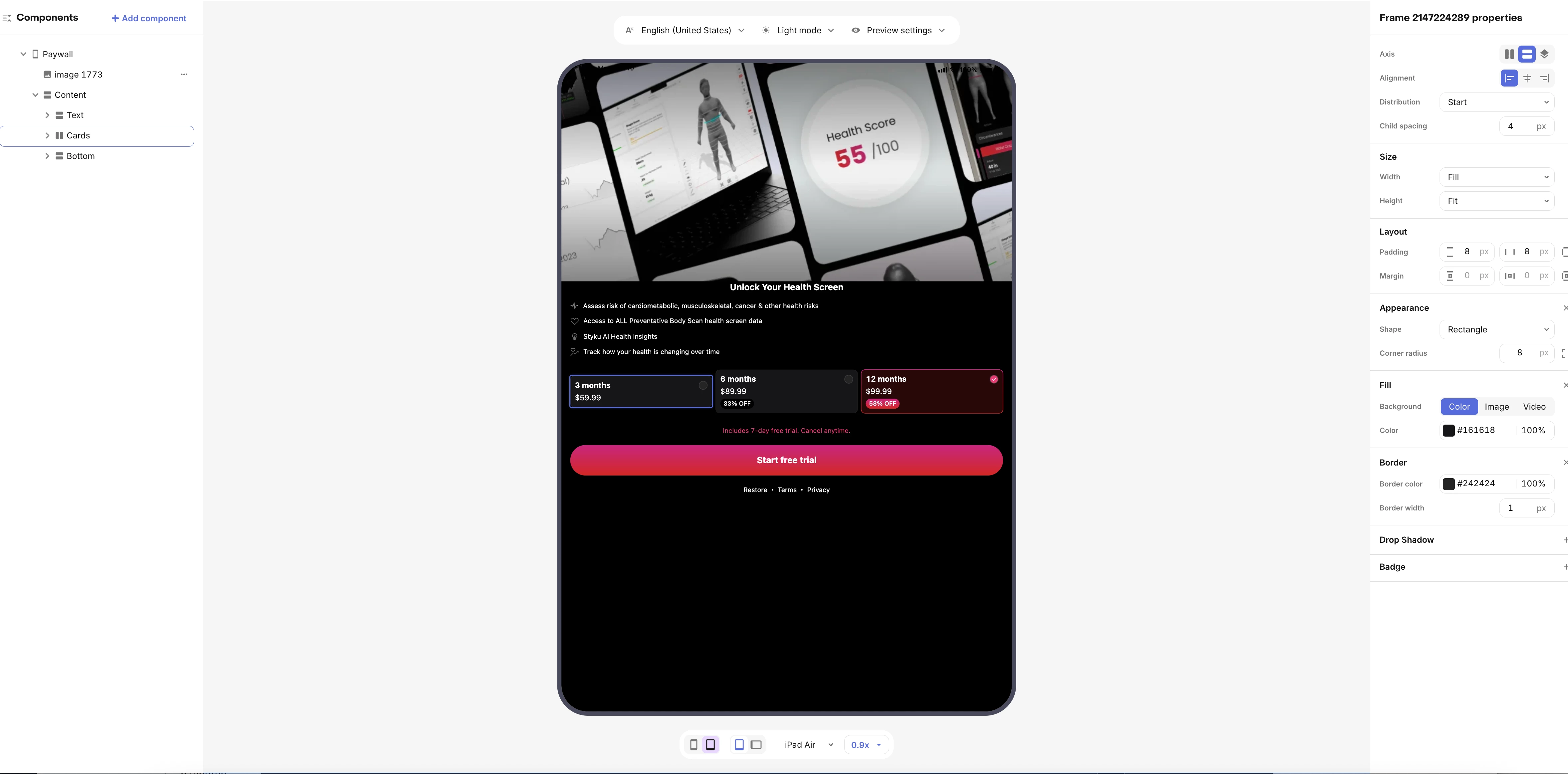 I’m doing my paywall designs on figma, they are working perfectly with auto-layout on figma. When I export it to Revenue cat with your plugin it doesn’t keep the responsiveness. Some elements look weird (fill is not doing fill in some cases).