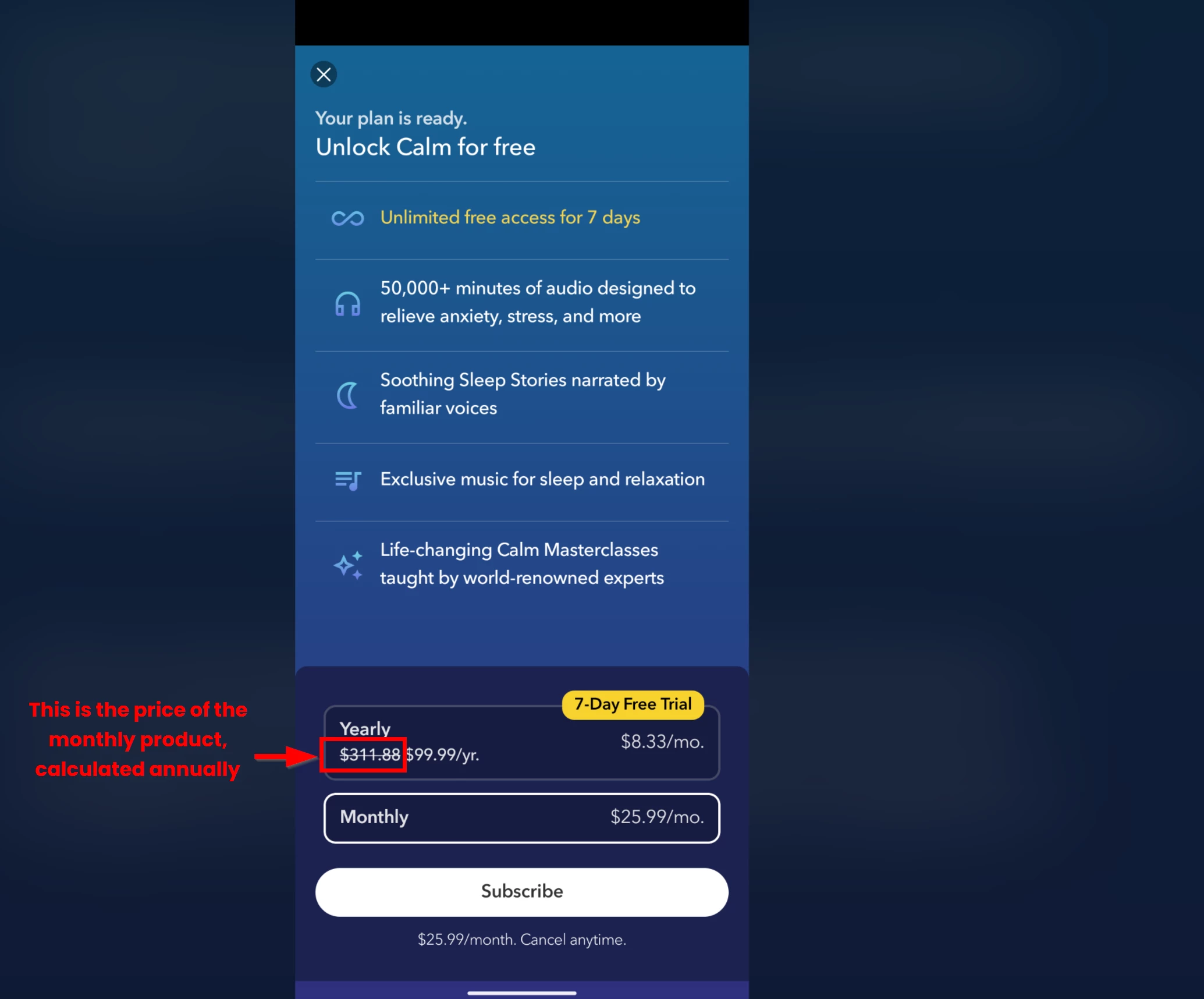 See the below screenshot for an example of Calm’s paywall. This is what I am trying to achieve.