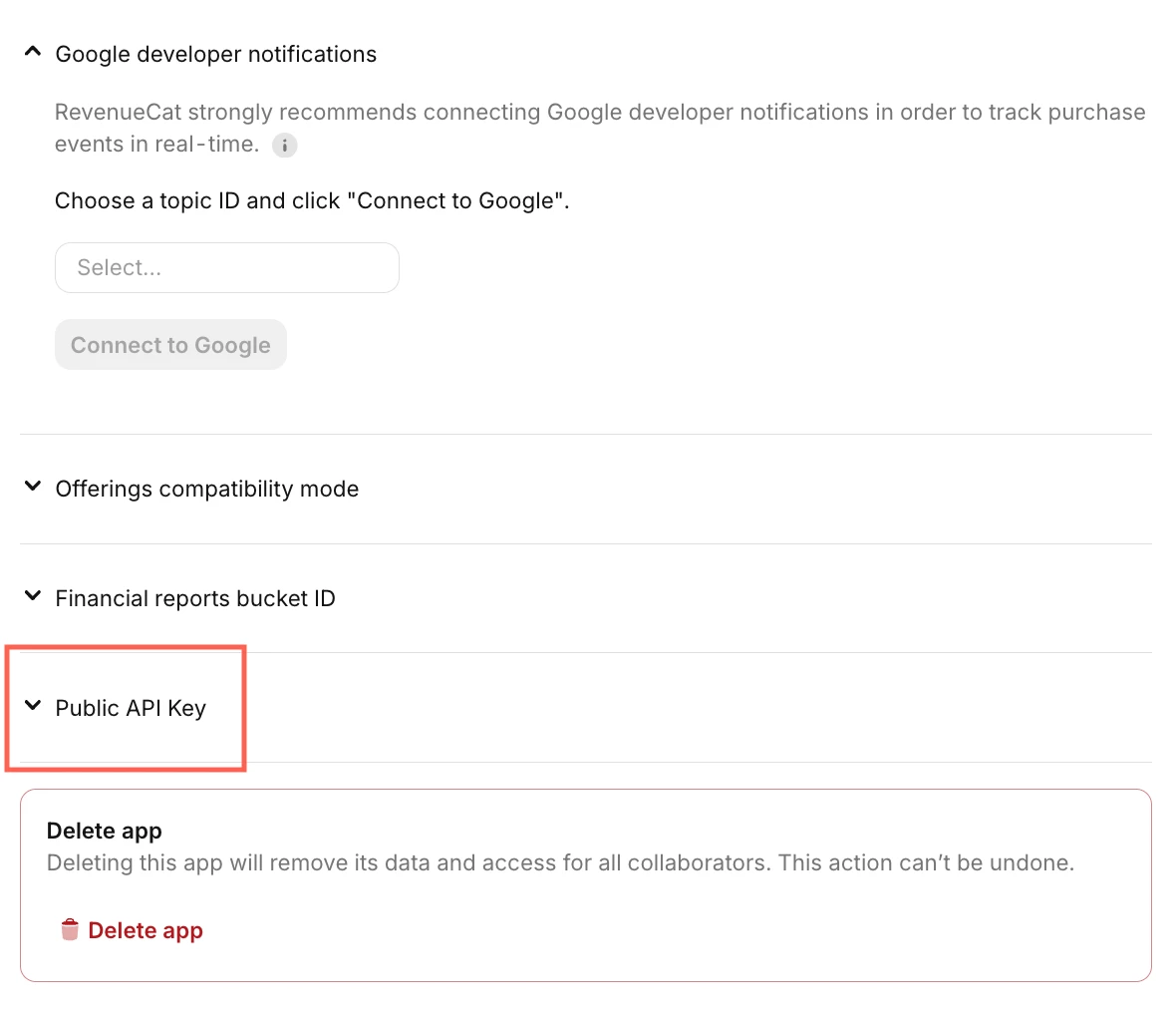 The API Key you’re using when calling the configure method is not the correct one. You’re still using the one generated by RevenueCat’s Test Store. To troubleshoot this issue, you need to replace the API key with the one displayed in your Android app's configuration. For privacy reasons, I will not post it here; however, please refer to the screenshot below for reference on where to find it.