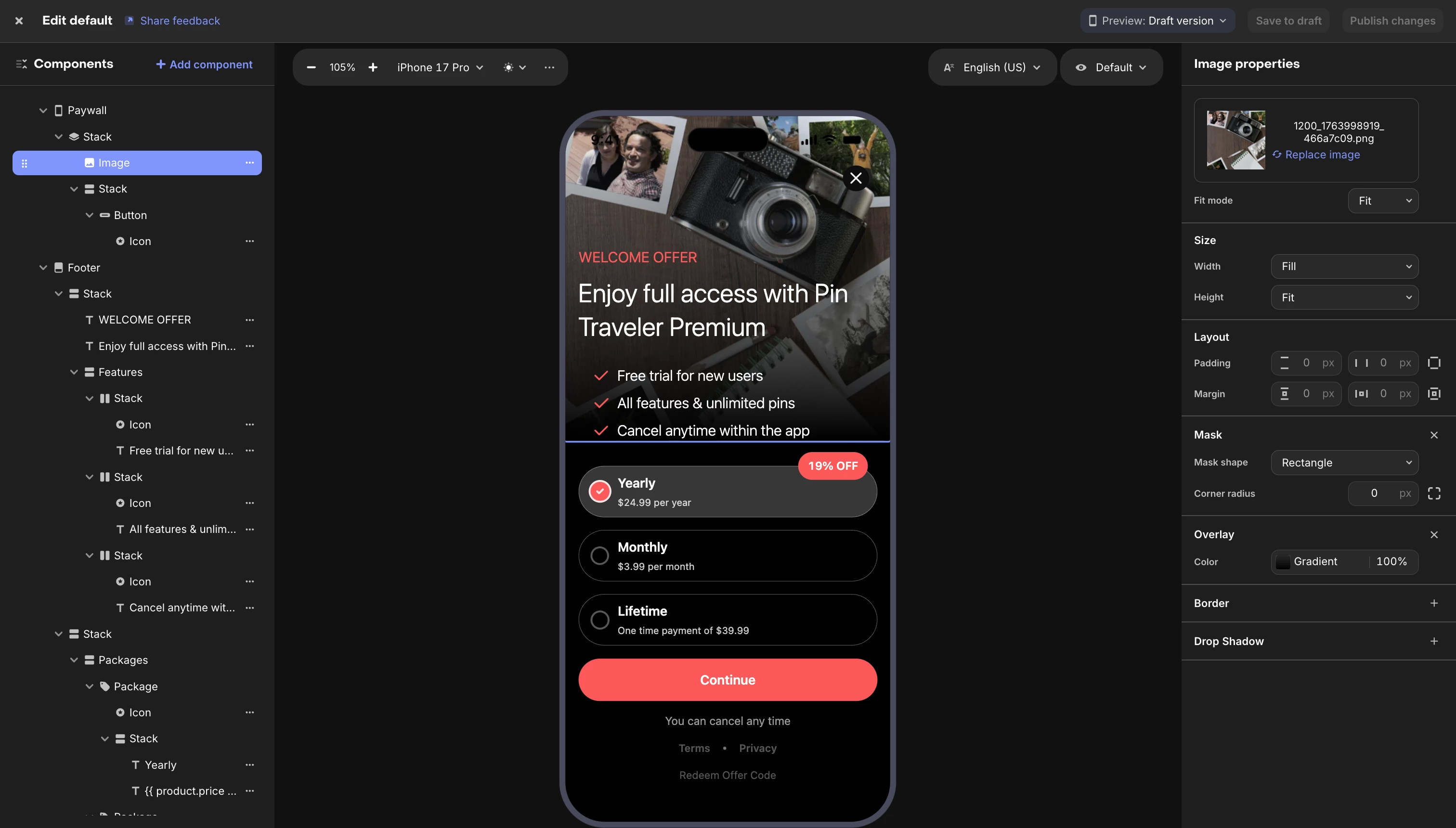 - When I have an image in the paywall body (in a ZStack with my close button in this case) and my paywall content in the footer, I believe the footer content should draw on top of the image, this is also what the paywall editor shows. When I run this paywall though, I see the footer strictly not overlap with the image. The image instead seems to be pushed upwards. Interestingly the overlay gradient is also not visible in this case