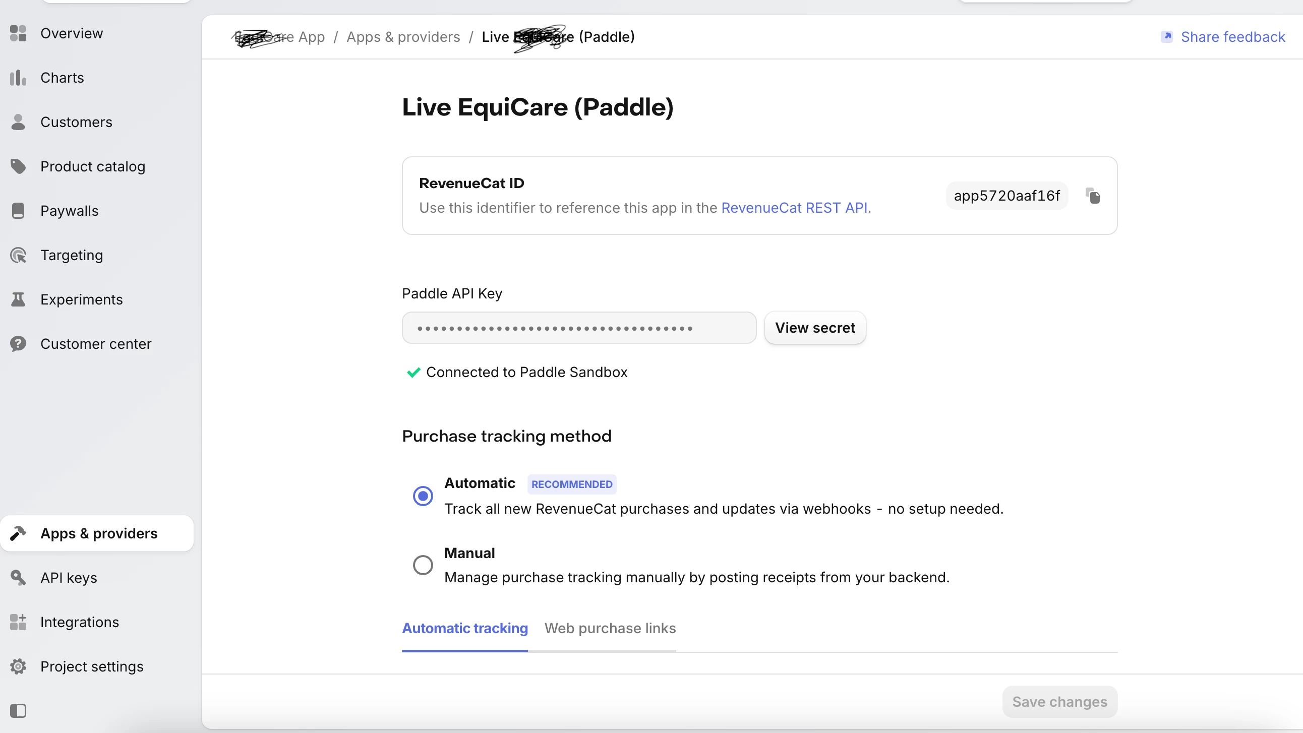 I have connected with live paddle account but it display me message connected to paddle sandbox. If I have want change any thing live automatic to manual save not actIve, it is always disable and I am not able to save the changes.
