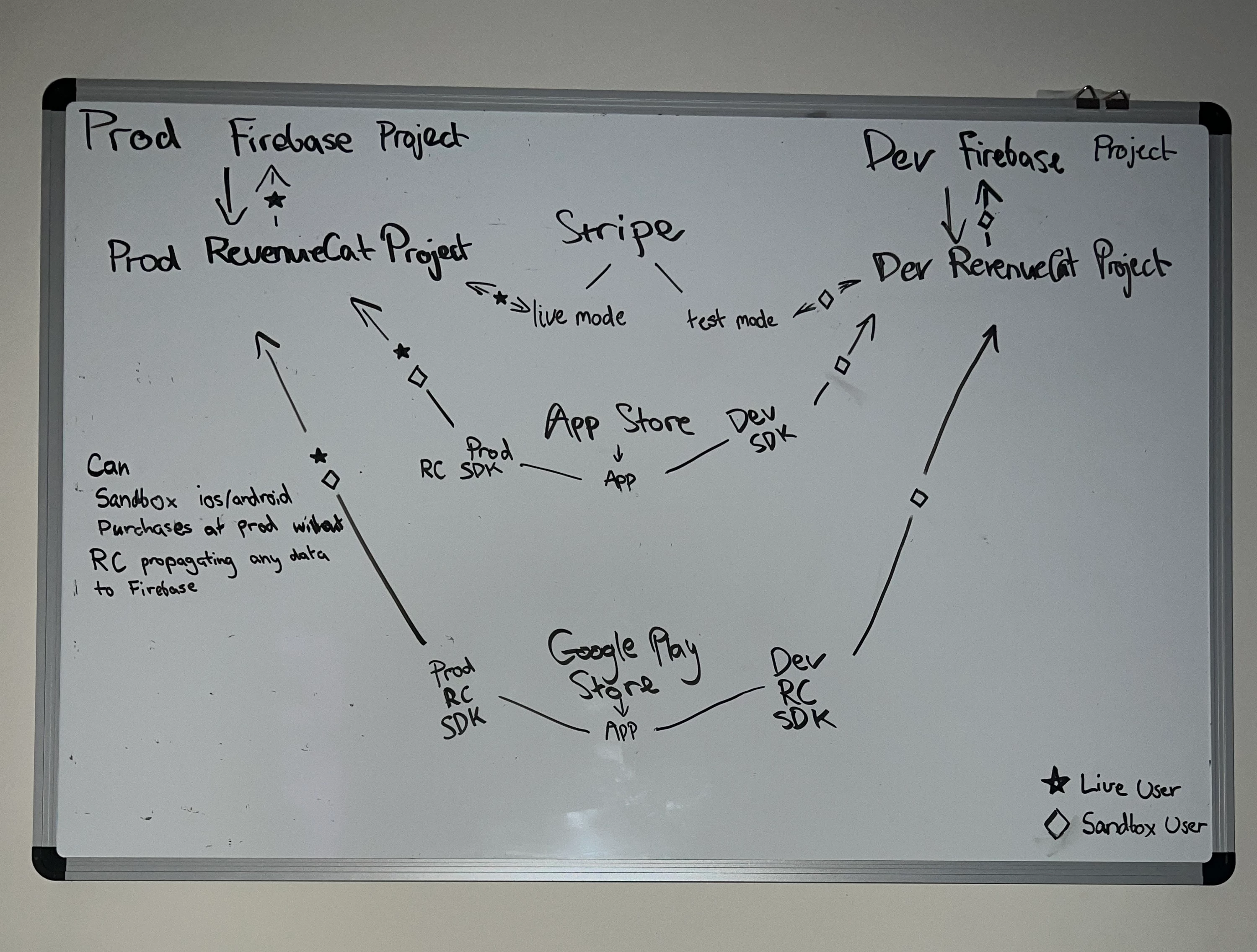 However, if you are not using server notifications, the configuration of your split environment would be easier. You’d just need to ensure that the correct SDK keys are used (e.g. using the Dev RC Project’s Google Play App SDK Key for sandbox play store purchases).