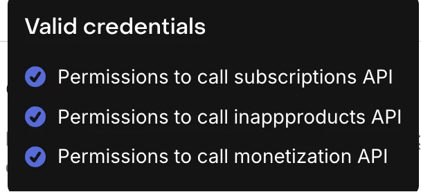 In RevenueCat’s dashboard, the following permissions are all correctly set: