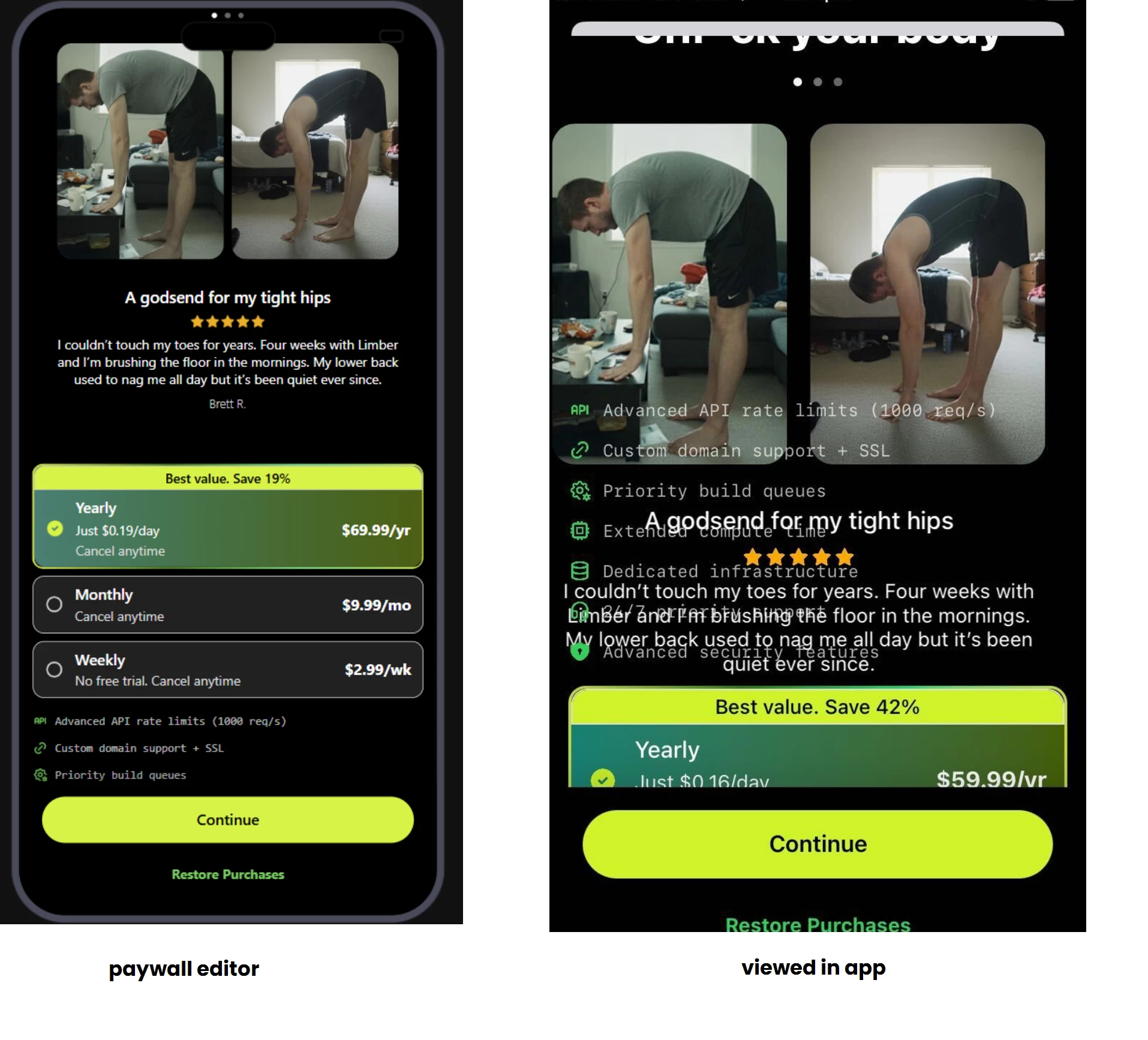 But when I preview the paywall in the app, my stacks seem to overlap my carousel. Why do they overlap and how can I stop them from overlapping? As far as I can tell from the Paywall Editor, this shouldn't be happening.