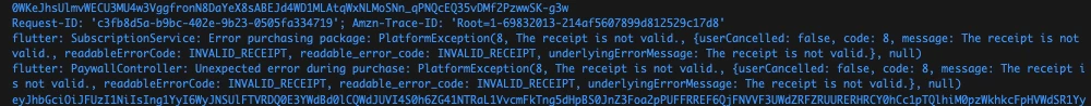 flutter: SubscriptionService: Error purchasing package: PlatformException(8, The receipt is not valid., {readableErrorCode: INVALID_RECEIPT, message: The receipt is not valid., underlyingErrorMessage: The receipt is not valid., readable_error_code: INVALID_RECEIPT, userCancelled: false, code: 8}, null)