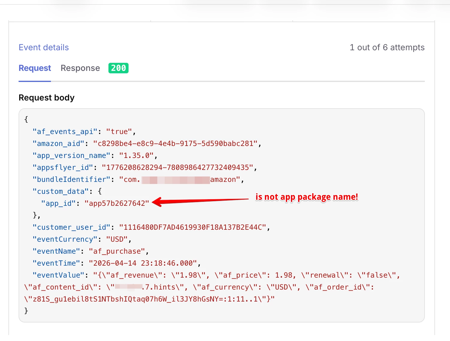 Appsflyer replied that the problem lies in the request data between the servers (RevenueCat → Appsflyer).