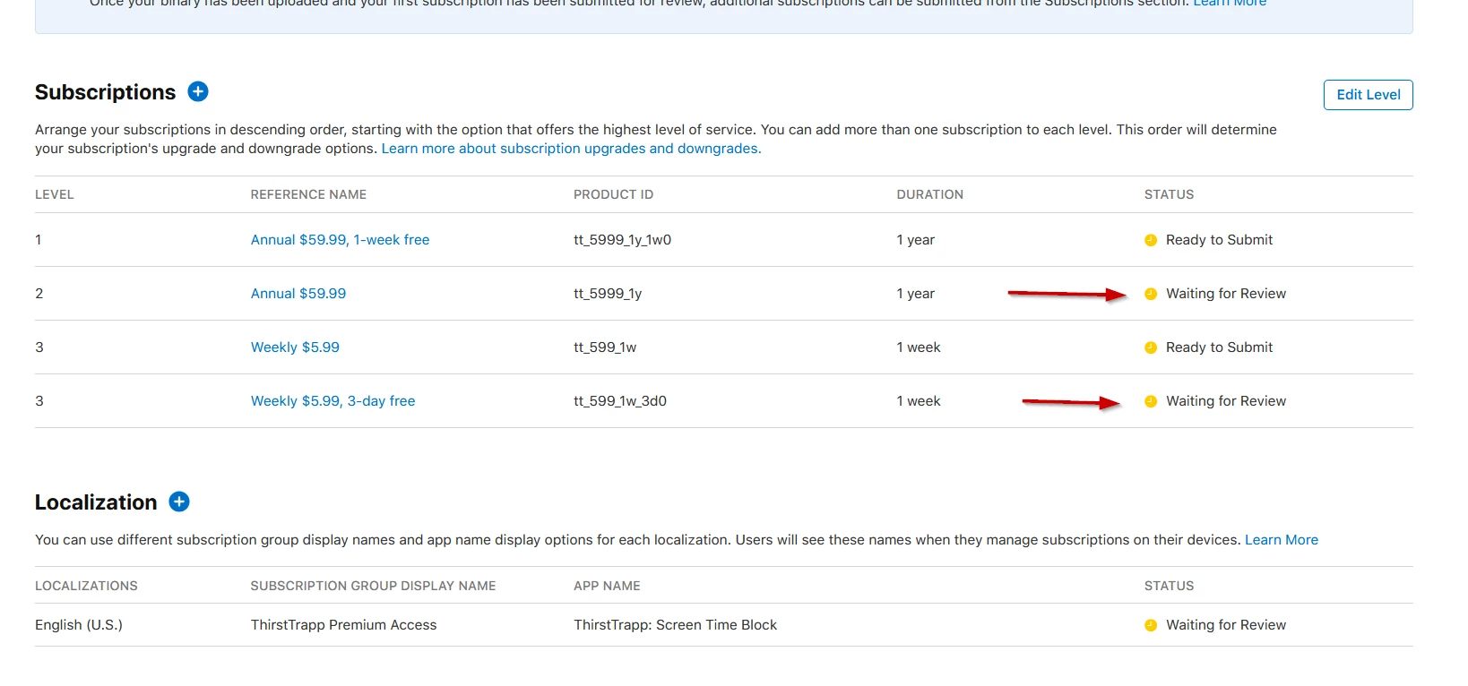 My 2 desired subs were originally "Developer Action Needed" (apparently because the generic "Premium access" name was rejected)