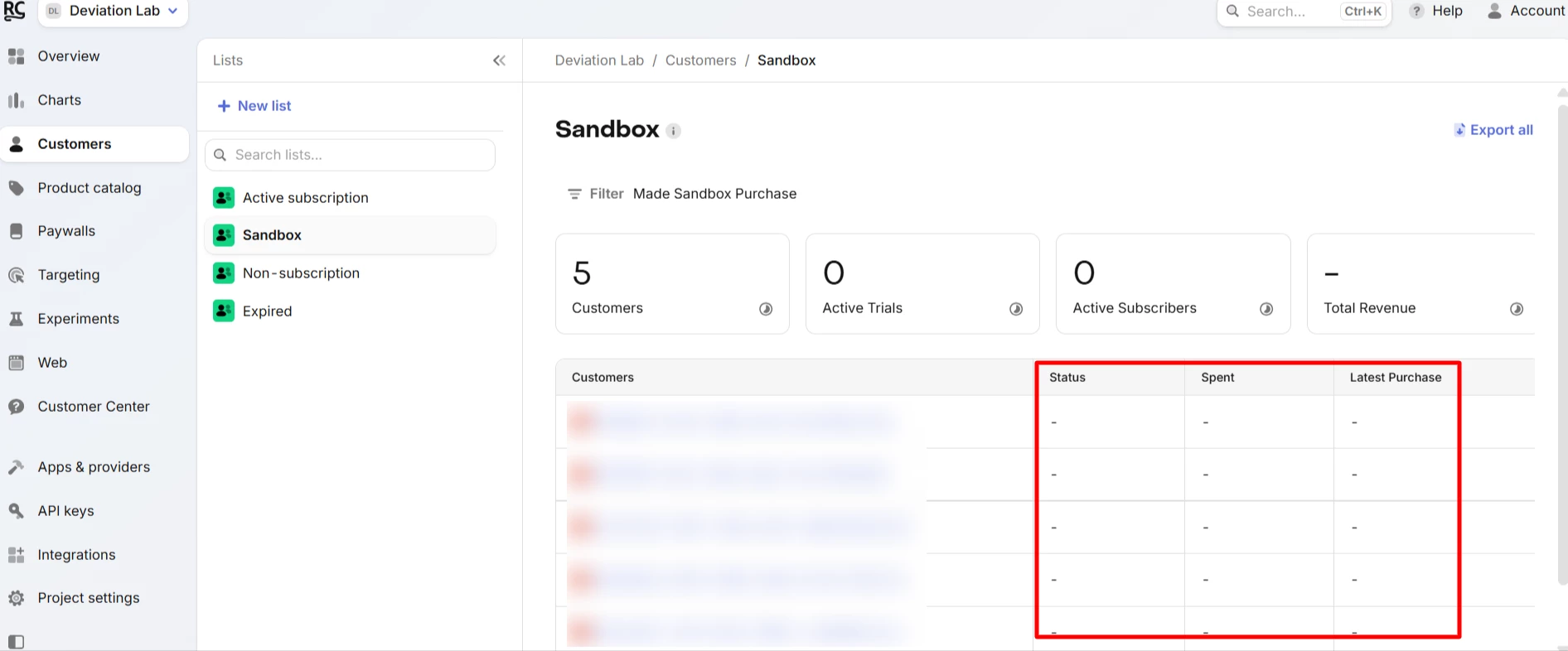 After checking this internally with the Engineering team, this is expected. Customer Lists are intended for use in production purchases. We display Sandbox Customers so that you can track the users who have made Sandbox Purchases. However, statistics about them will not appear unless those users have also made production purchases.