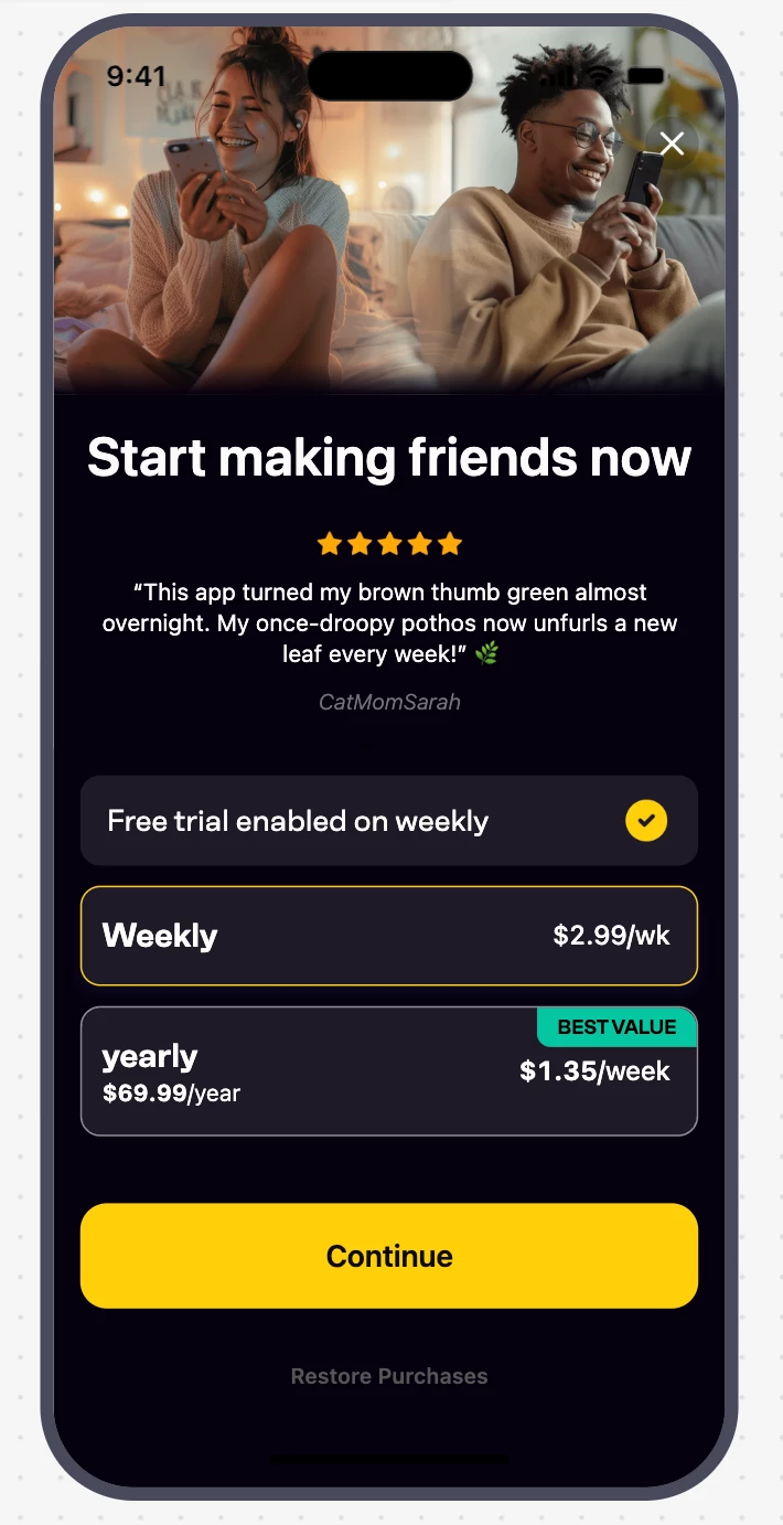 If the Weekly package is selected (which has a free trial enabled), I want the button to display: "Try for free".