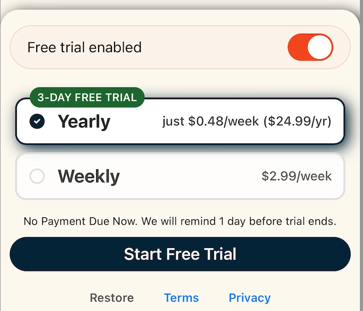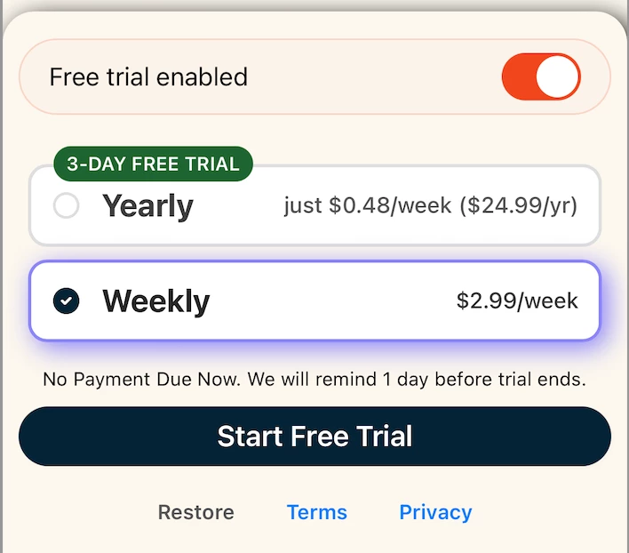 • a toggle that switches between a yearly plan with 3-day free trial and a weekly plan without trial, and
